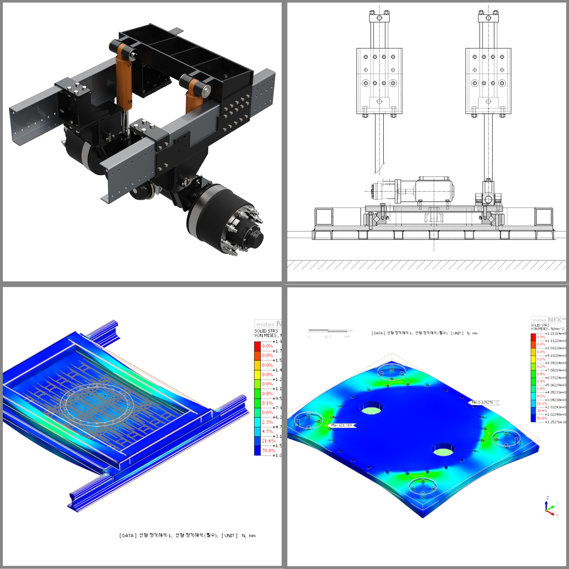 특수 차량을 위한 리프트업 서스펜션 설계로서, 특럭 하부의 좁은 공간에 장착 가능한 리프트 서스펜션을 설계와 제작도면 작성.